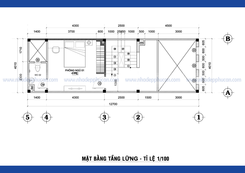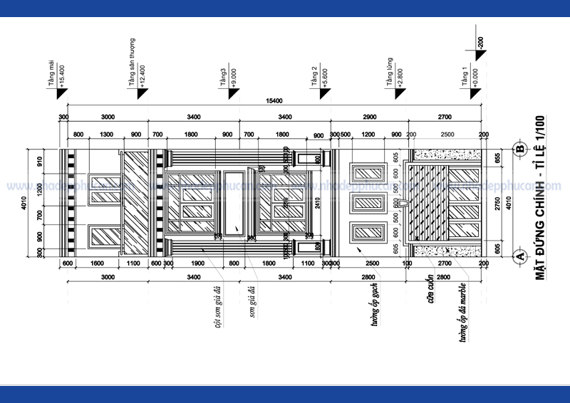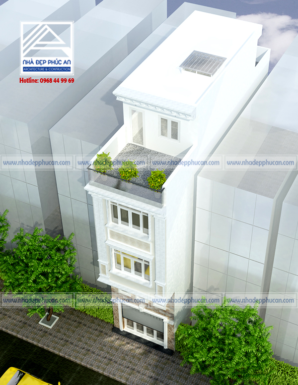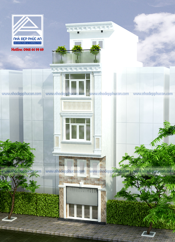 Mẫu thiết kế nhà phố cổ điển – mặt tiền 4m – 1 trệt – 1 lửng – 2 lầu – sân thượng.
