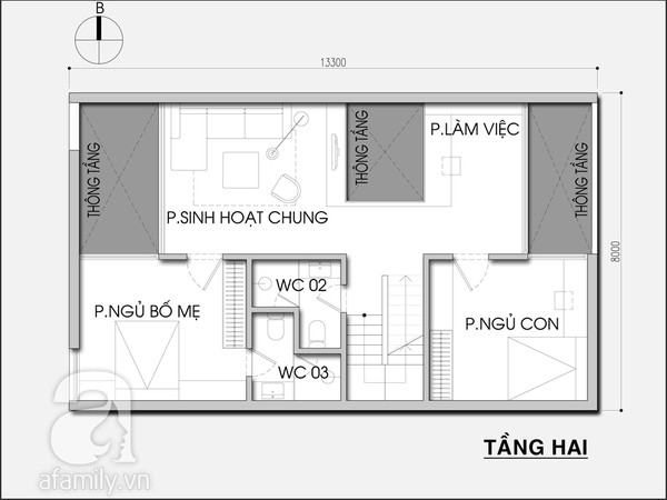 – Tầng 2: Phòng ngủ cho bố mẹ, phòng ngủ cho con, phòng sinh hoạt chung.